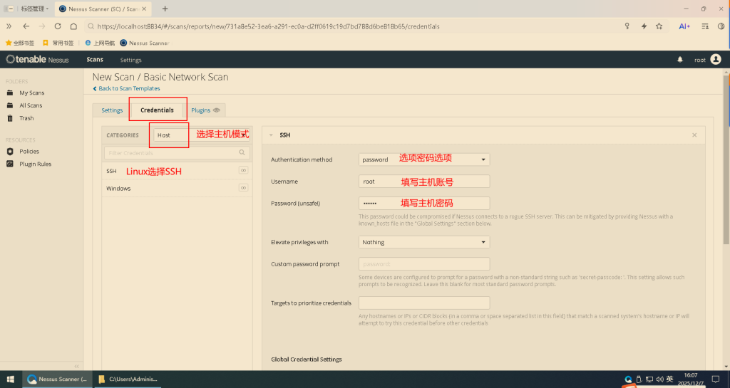 5.【步骤可选】切换到Credentials(凭证)页签,按图示设置,其他默认(①正常业务中,主机扫描基本不需要这一步,也就是未登录状态下进行扫描,也叫网络扫描,外部扫描;②如果业务沟通,强调需要登录后扫描再看这一步,登录状态下扫描叫代理扫描,也叫内部扫描,扫描深度相比网络扫描更深,相对时间越久;③登录状态下作主机扫描,有时会影响正在进行的业务;③正常情况下,主机扫描默认不登录)