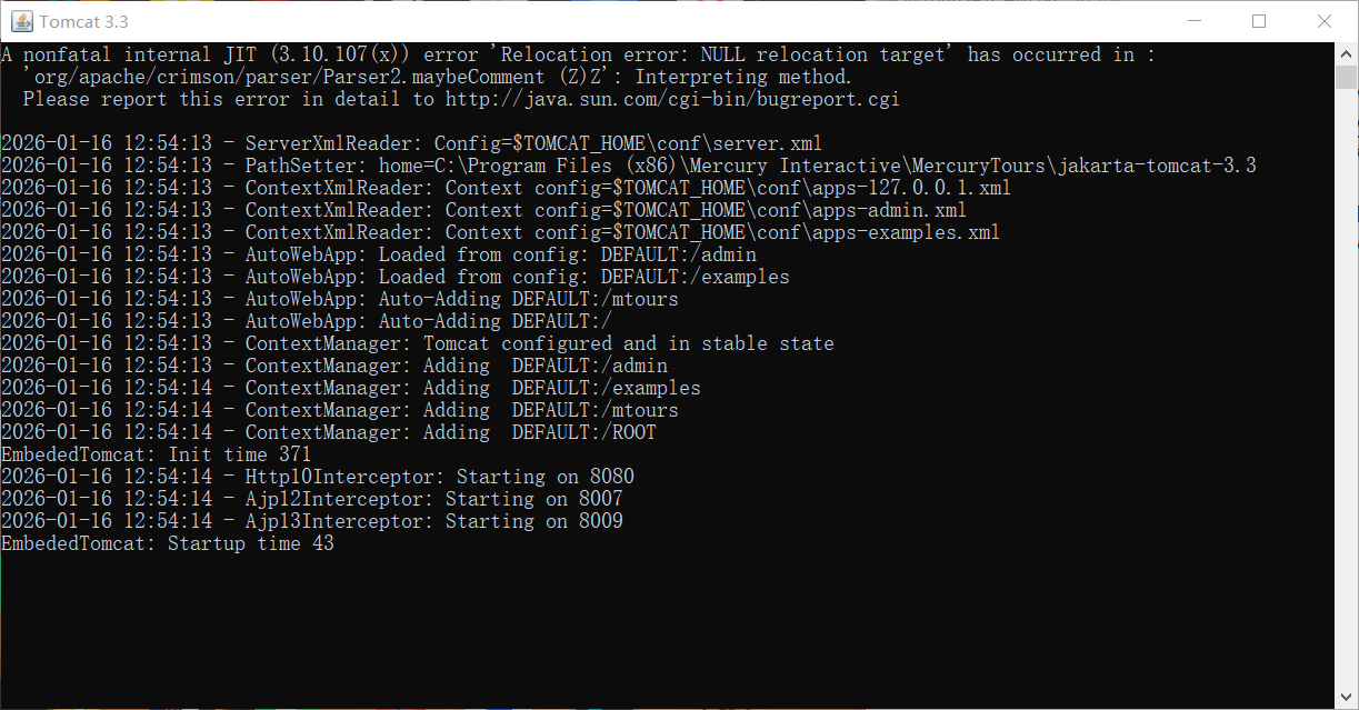 2、启动Tomcat服务:开始–>所有程序–>MTours–>Start Server,不要关闭Tomcat服务窗口