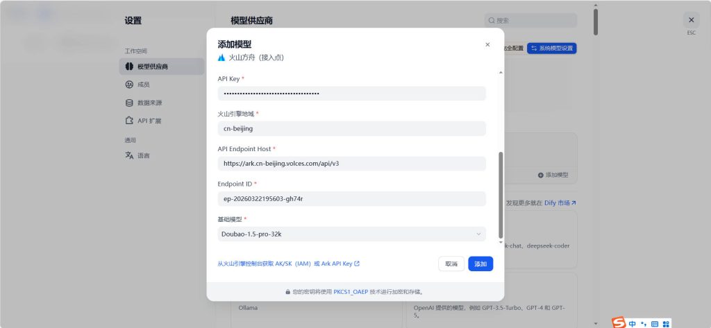 Dify里火山方舟(接入点)模型参数配置 作者: admin 分类: 闲言碎语 发布时间: 2026-03-30 18:39 今日分享:Dify里火山方舟(接入点)模型参数配置 配置截图: 有疑问的是Endpoint ID,数据源来自这里: dify模型对接dify模型配置 如果觉得我的文章对您有用,请随意赞赏。您的支持将鼓励我继续创作! 赞赏支持 发表回复 取消回复要发表评论,您必须先登录。